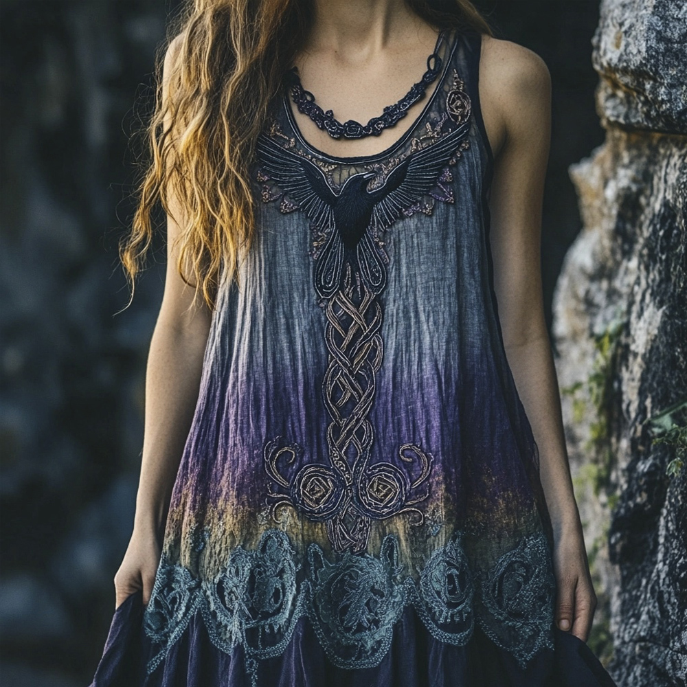 Raven Embroidered Vintage Lace Women's Linen Vest Dress