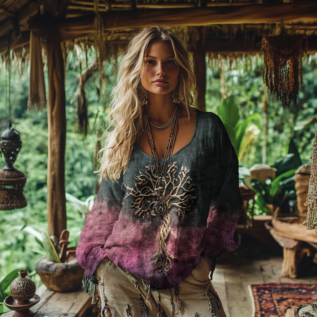 Women's Viking Celtic Knot Style Tree Of Life Rainbow Art Linen Casual T-shirt