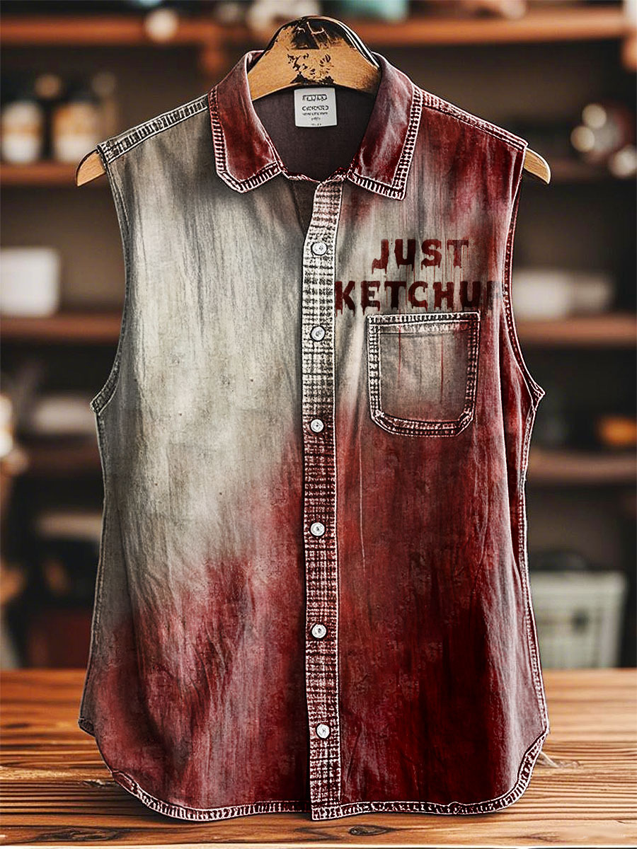 Vintage Humorous Blood Just Ketchup Halloween Print Casual 100% Cotton Sleeveless Lapel Shirt
