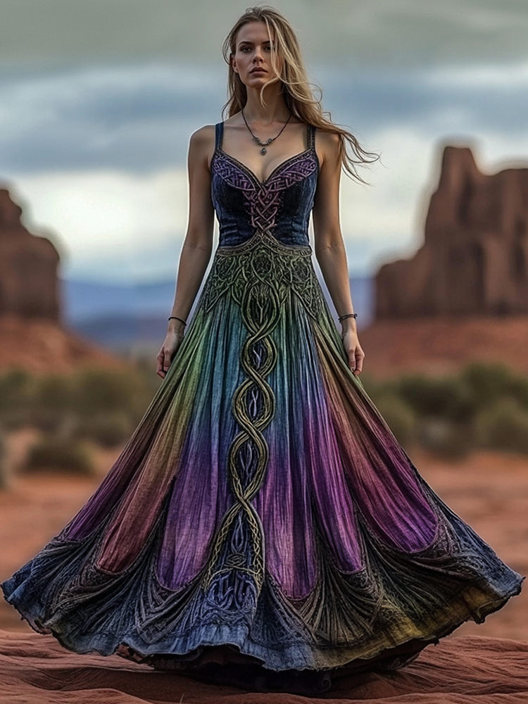 Women's Vintage Viking Celtic Knot Gradient Art Linen Vest Dress