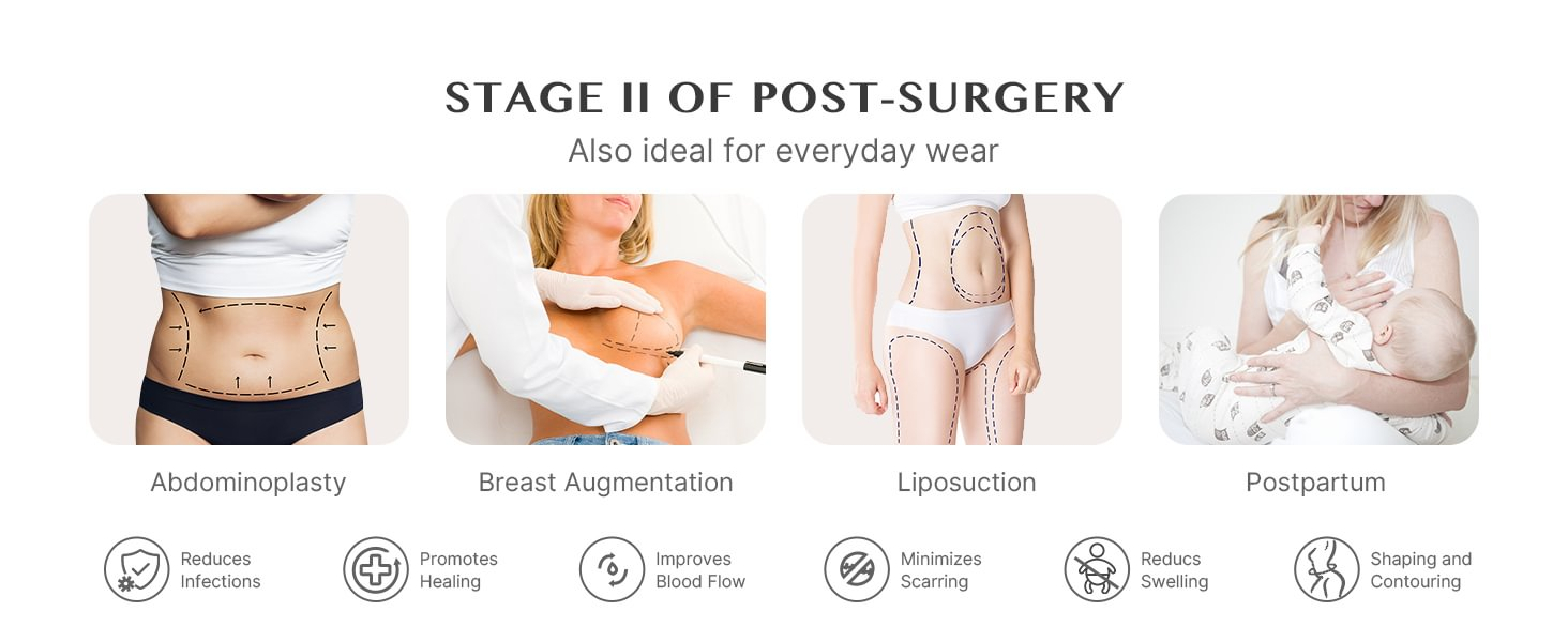 • Post-operation support: Our stage 2 bbl faja is specifically designed to provide gentle yet firm compression to the treated areas after abdominal post surgery. This support aids in reducing swelling, promoting faster healing and minimizing post-operative discomfort.