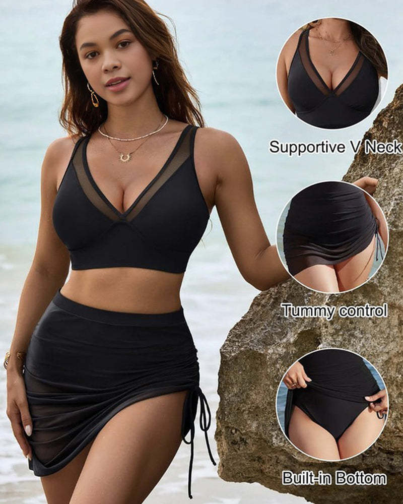 Mesh High Waisted Tummy Control Sarong Wraps Bikini Set