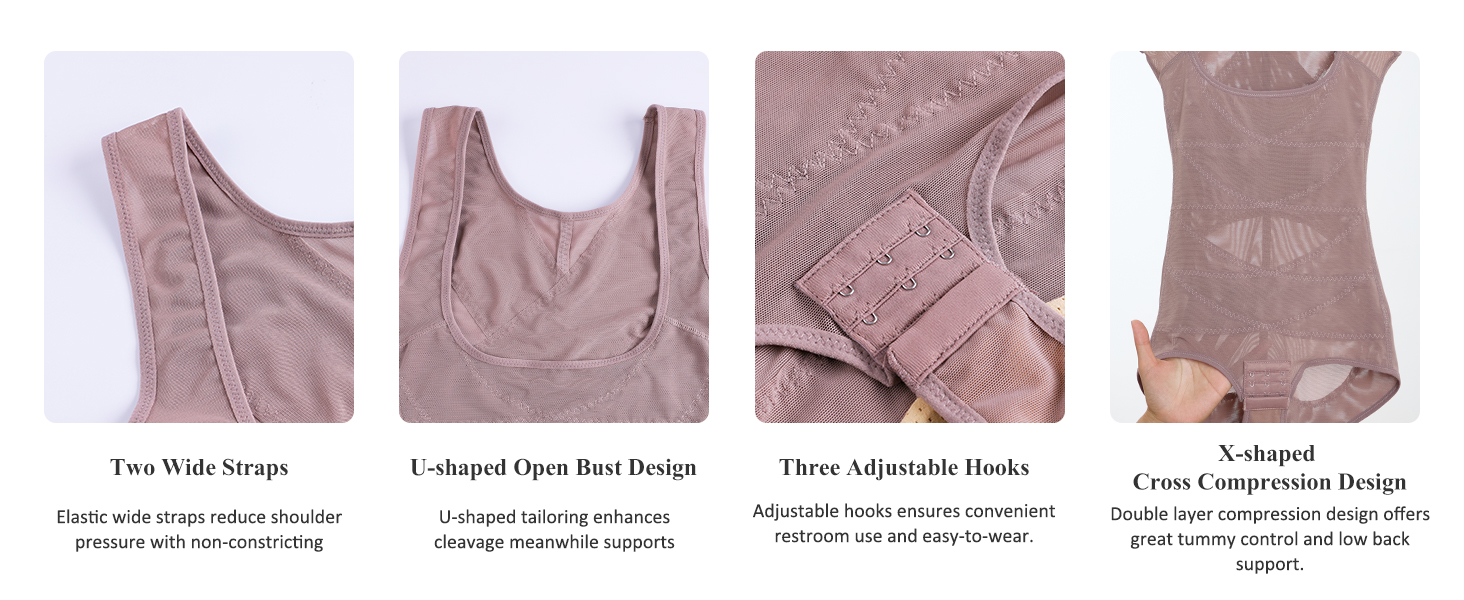 - Shapewear bodysuit tummy control. The front of our body shaper bodysuit boasts a chic cross double-layer design to reinforce tummy control, aiding in sculpting a slimmer waistline. The x-shaped back design of plus size shapewear bodysuit aligns and supports your back, wrapping your body for improved posture and a streamlined profile. This thoughtful construction not only enhances your body's contours but also promotes a confident posture, ensuring you look and feel your best from every angle.