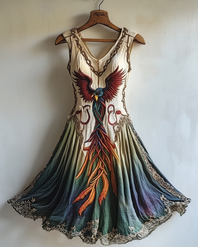 Women's Viking Celtic Knot Phoenix Totem Gradient Linen Midi Dress