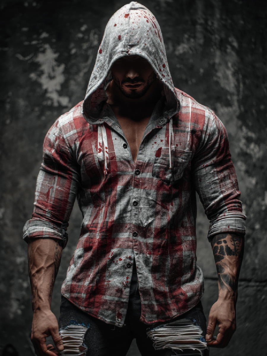 Bloodstained Vintage Check Art Hooded Long Sleeve Button-Down Shirt