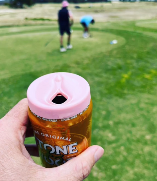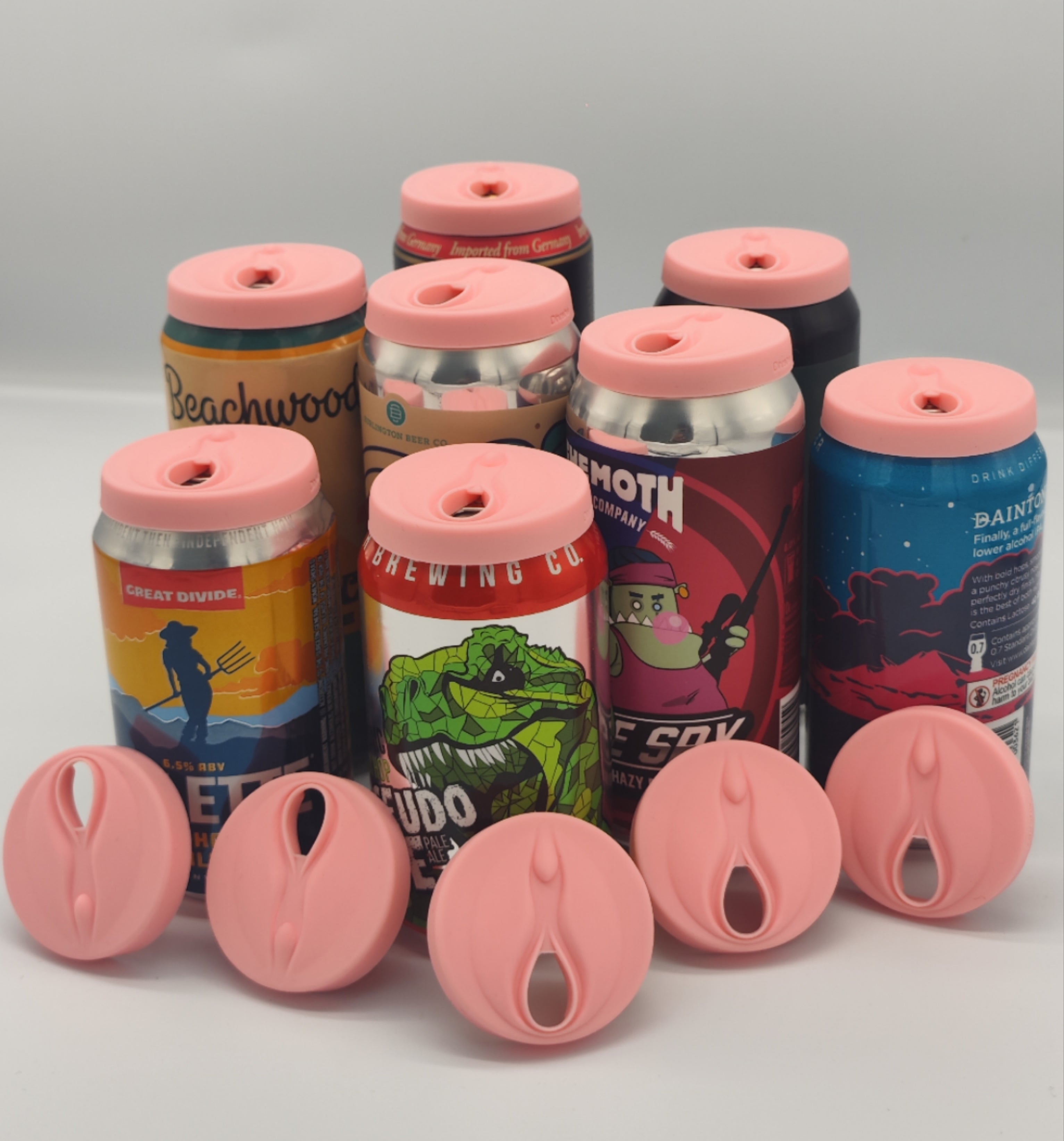 Description: Vagina-shaped lid that fits on top of standard aluminum beverage cans.
