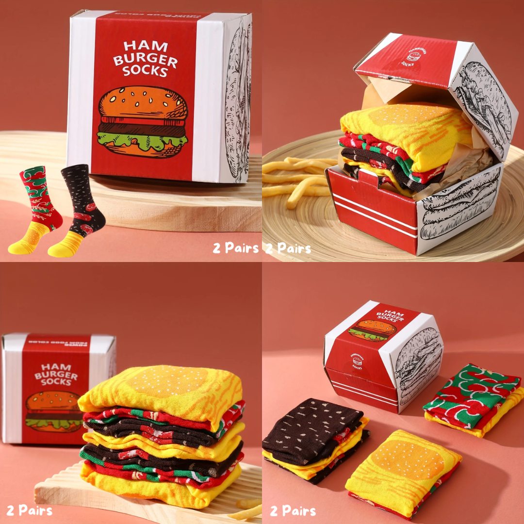 Comes with 2 pairs of hamburger themed socks packed in a hamburger shape, all in this super fun takeaway box!