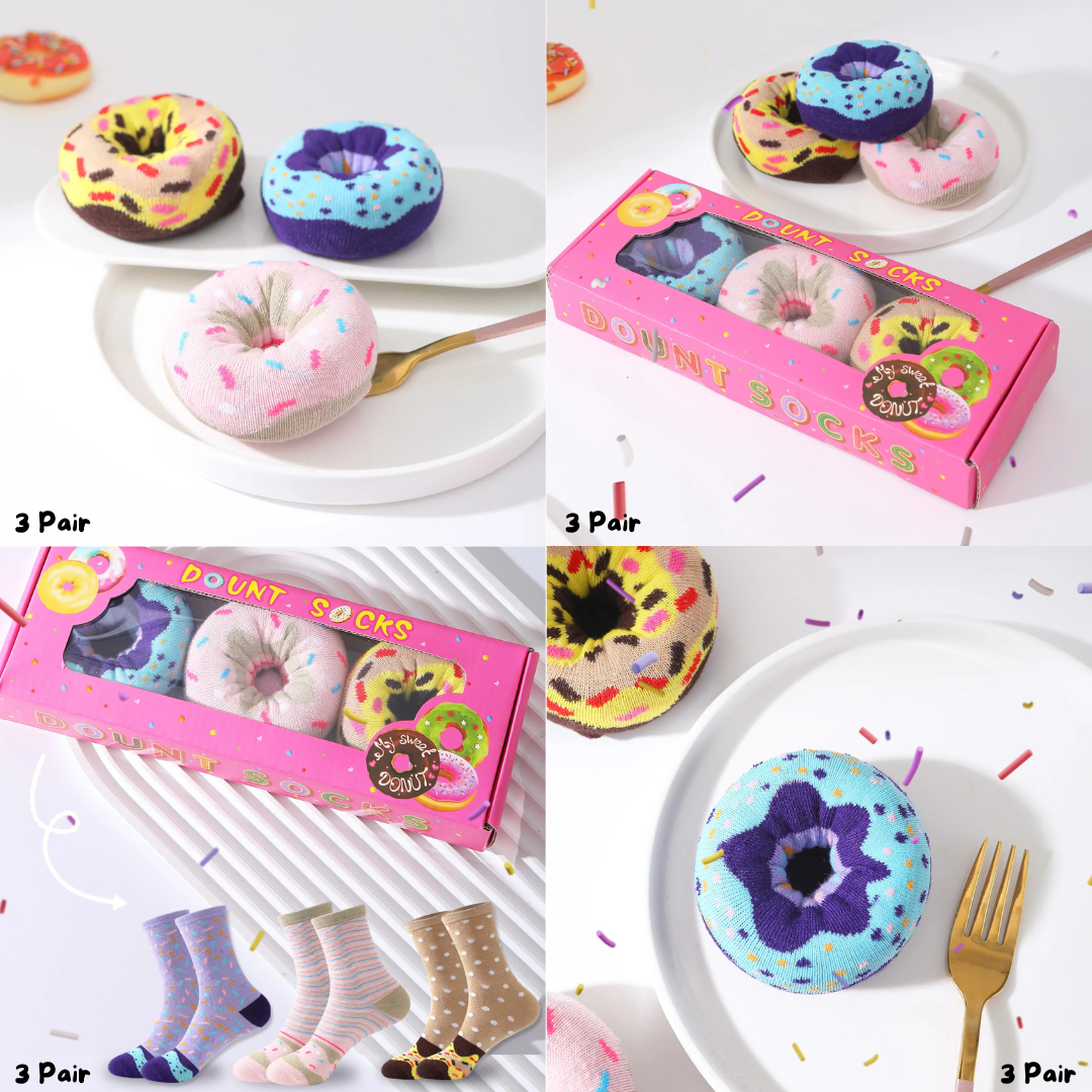 Comes with 3 pairs of donut themed socks rolled into 2 donuts and packed into the perfect donut treat windowed box!