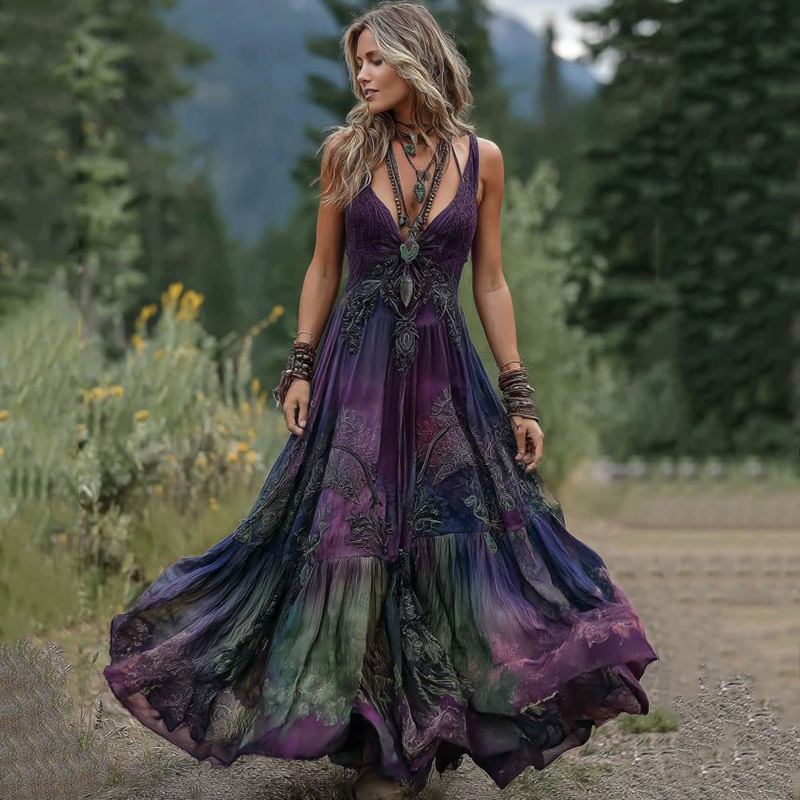 Women's Viking Celtic Gradient Floral Art V-neck Maxi Dress